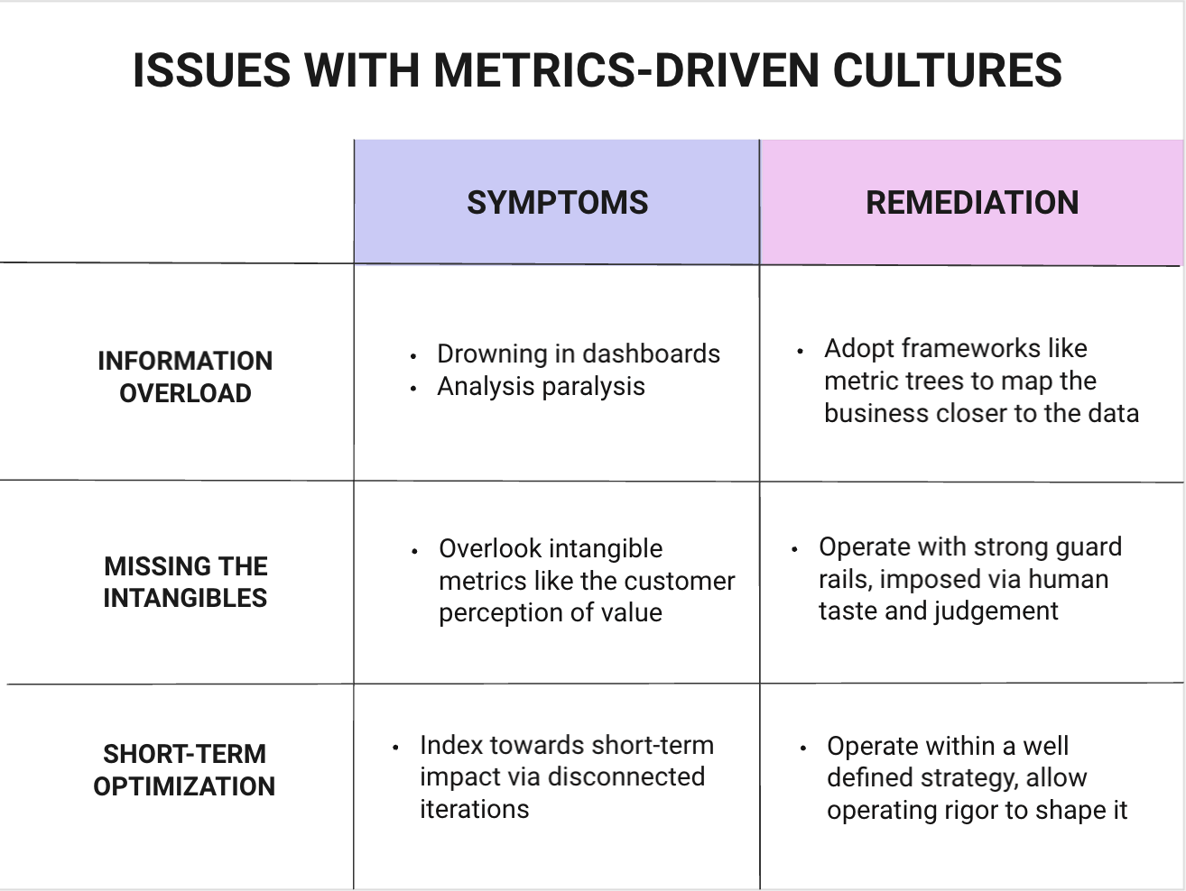 When organizations become hyper-focused on metrics, there’s a risk of missing the intangibles—like how customers perceive the product’s value—which can't always be captured by a single metric.